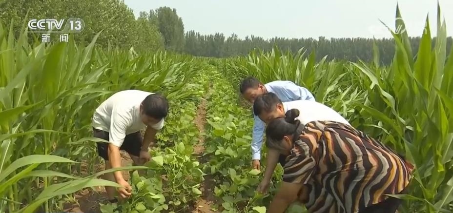在內(nèi)黃縣石盤屯鄉(xiāng)牛林村的玉米大豆套種種植區(qū),玉米長(zhǎng)勢(shì)挺拔、碩大飽滿。種植大戶徐改云正在田間采掰成熟的首茬鮮食玉米。