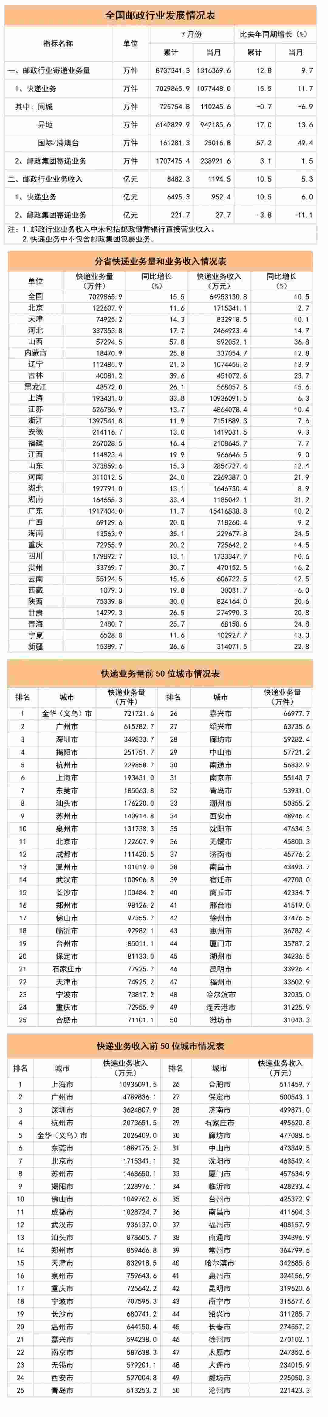 1-7月,郵政行業(yè)業(yè)務(wù)收入(不包括郵政儲(chǔ)蓄銀行直接營(yíng)業(yè)收入)累計(jì)完成8482.3億元,同比增長(zhǎng)10.5%。其中,快遞業(yè)務(wù)收入累計(jì)完成6495.3億元,同比增長(zhǎng)10.5%。7月份,郵政行業(yè)寄遞業(yè)務(wù)量完成131.6億件,同比增長(zhǎng)9.7%。其中,快遞業(yè)務(wù)量完成107.7億件,同比增長(zhǎng)11.7%。7月份,郵政行業(yè)業(yè)務(wù)收入完成1194.5億元,同比增長(zhǎng)5.3%。其中,快遞業(yè)務(wù)收入完成952.4億元,同比增長(zhǎng)6.0%。1-7月,同城、異地、國(guó)際/港澳臺(tái)快遞業(yè)務(wù)量分別占全部快遞業(yè)務(wù)量的10.3%、87.4%和2.3%;業(yè)務(wù)收入分別占全部快遞收入的6.0%、50.6%和11.2%。與去年同期相比,同城快遞業(yè)務(wù)量的比重下降1.7個(gè)百分點(diǎn),異地快遞業(yè)務(wù)量的比重上升1.1個(gè)百分點(diǎn),國(guó)際/港澳臺(tái)業(yè)務(wù)量的比重上升0.6個(gè)百分點(diǎn)。