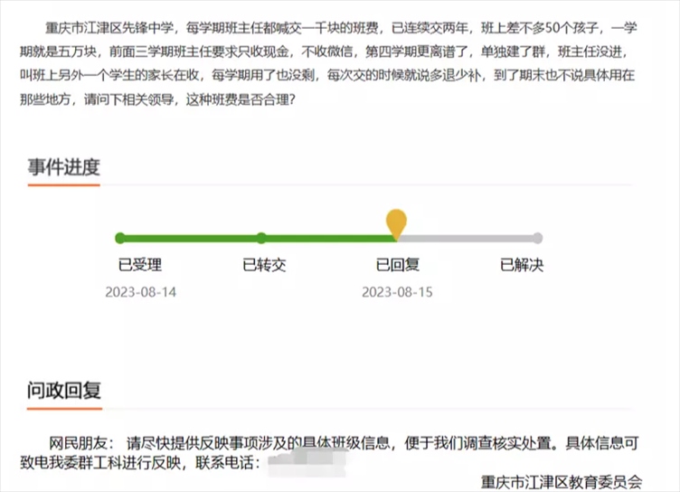 ·重慶江津某中學一班級收5萬元班費,每人一學期交1000元。區(qū)教委:已啟動調(diào)查程序,督促學校自查。