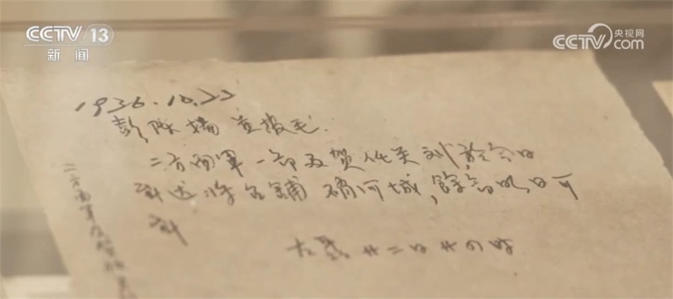 六盤山紅軍長征紀(jì)念館館長 李玲:在我們紀(jì)念館里也陳列展出了一組非常珍貴的、紅軍長征過程當(dāng)中的電文,其中有一張就是1936年10月22日,您看在這里,這個日子也是紅一和紅二方面軍在西吉將臺堡勝利會師的日子。