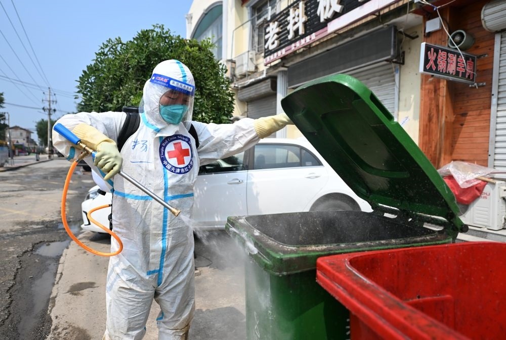 8月17日,工作人員在天津市靜海區(qū)臺頭鎮(zhèn)進行消殺作業(yè)。新華每日電訊記者趙子碩攝