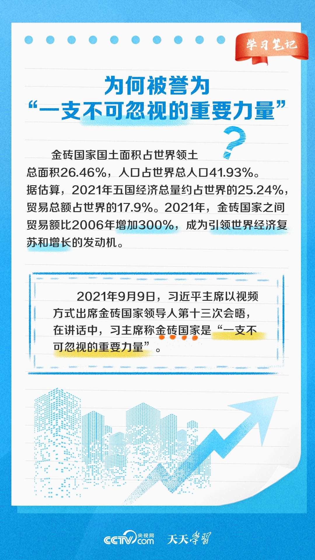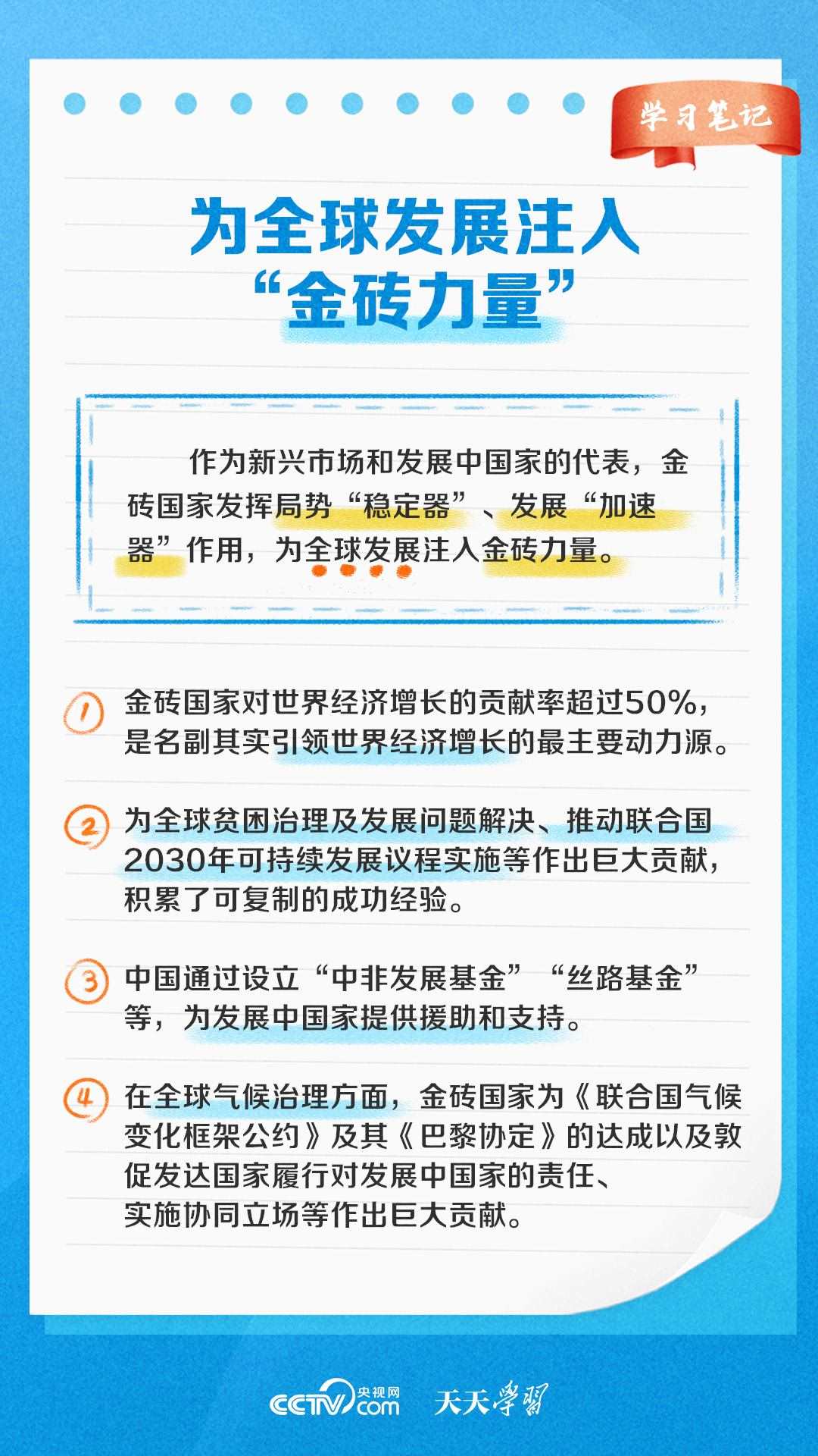自金磚國(guó)家合作機(jī)制建立以來(lái),金磚國(guó)家合作不斷走深走實(shí),成為帶動(dòng)世界經(jīng)濟(jì)增長(zhǎng)、完善全球經(jīng)濟(jì)治理、推動(dòng)國(guó)際關(guān)系民主化的重要力量之一?!短焯鞂W(xué)習(xí)》特推出《學(xué)習(xí)筆記》,與您一起了解金磚國(guó)家合作機(jī)制緣何擁有強(qiáng)勁生命力。