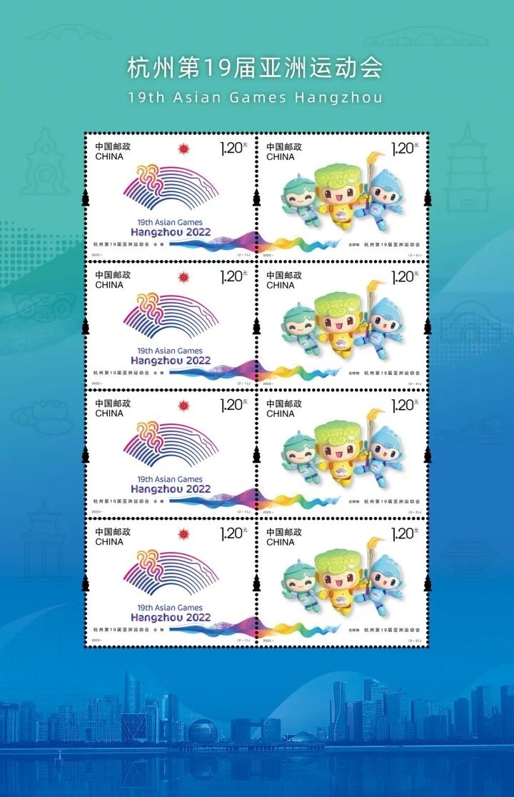 杭州亞運會紀念郵票一套2枚,志號為2023-19。兩枚郵票主體分別表現(xiàn)杭州亞運會會徽和吉祥物,襯以核心圖形“潤澤”,充分直觀地反映杭州亞運會主題。