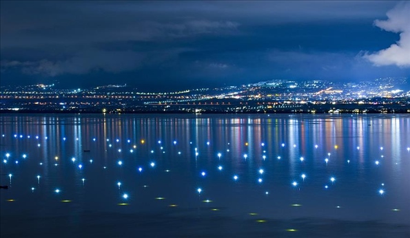 云南大理洱海湖面上,星星點點的漁燈點亮湖面,宛若繁星灑落,如夢似幻。