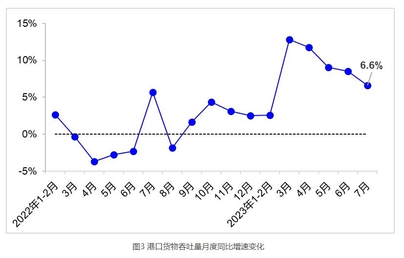 7月,全國港口完成貨物吞吐量14.3億噸,同比增長(zhǎng)6.6%,其中內(nèi)、外貿(mào)吞吐量分別增長(zhǎng)5.8%和8.5%。完成集裝箱吞吐量2705萬標(biāo)箱,同比增長(zhǎng)2.6%。