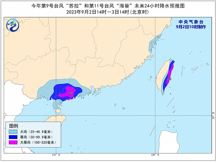 降水預(yù)報(bào):9月2日14時(shí)至3日14時(shí),受“蘇拉”和“??庇绊懀瑥V東西南部、廣西東南部、福建東北部沿海、臺(tái)灣島東部等地有大到暴雨,其中,廣東西南部、臺(tái)灣島東部等地部分地區(qū)有大暴雨(100~220毫米)。