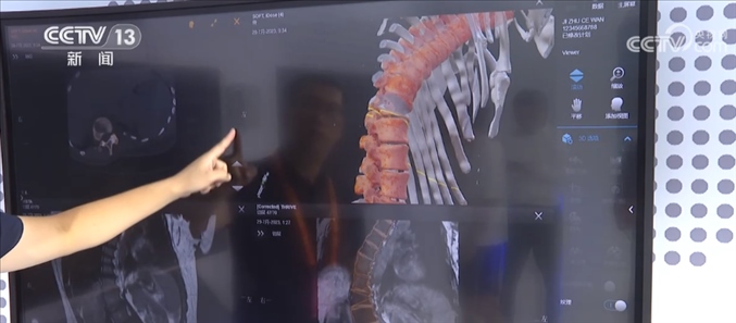 總臺記者 王豐:這里主要呈現(xiàn)的是一個智能手術(shù)室的系統(tǒng),這是一套幫助醫(yī)生進行精準手術(shù)計劃的設(shè)備,比如說我們可以利用一張X光片,一張CT或者一張核磁影像,就可以還原出一個3D的影像,醫(yī)生通過3D的建模,可以精準地看到病灶所在的位置,包括他如何下刀,來精準地制定手術(shù)計劃。