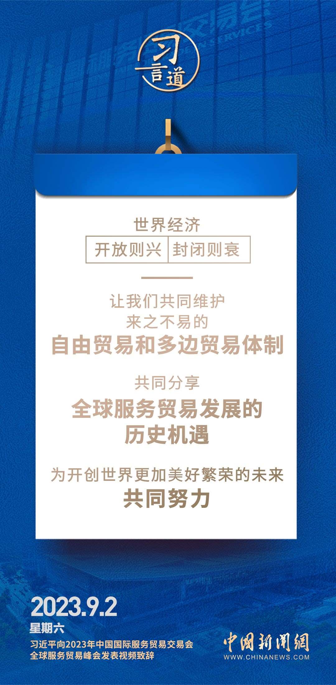 9月2日上午,國家主席習近平在北京向2023年中國國際服務貿易交易會全球服務貿易峰會發(fā)表視頻致辭。習近平指出——