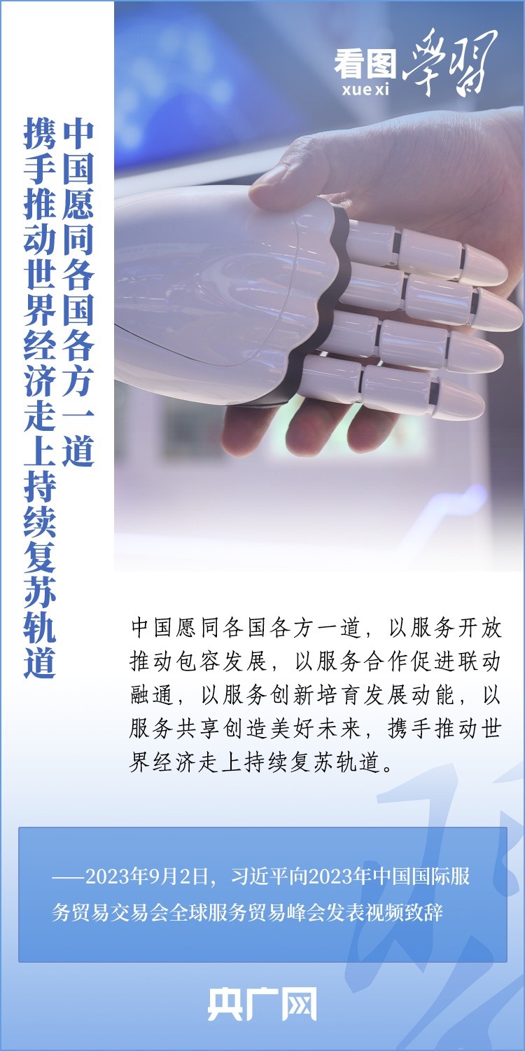 9月2日上午,以“開放引領發(fā)展 合作共贏未來”為主題的2023年中國國際服務貿易交易會在北京舉行。國家主席習近平向2023年中國國際服務貿易交易會全球服務貿易峰會發(fā)表視頻致辭表示,中國愿同各國各方一道,攜手推動世界經(jīng)濟走上持續(xù)復蘇軌道。一起來學習!