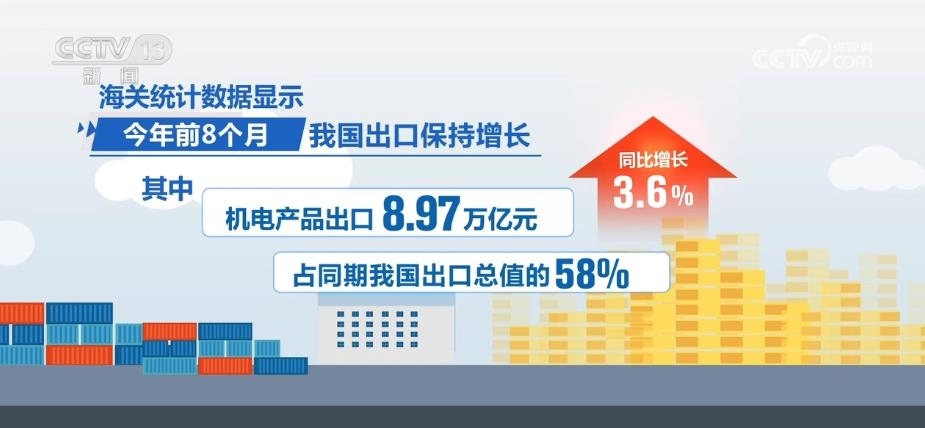 海關(guān)統(tǒng)計(jì)數(shù)據(jù)顯示,2023年前8個月,我國出口保持增長,其中,機(jī)電產(chǎn)品出口8.97萬億元,同比增長3.6%,占同期我國出口總值的58%;汽車及零配件、船舶、電工器材出口分別增長50.1%、28%、18.6%。