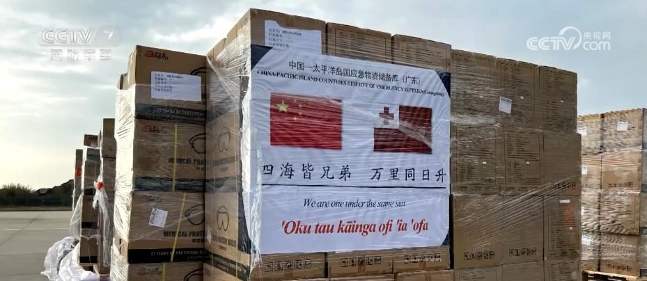 空軍航空兵某團 楊樹帥:當時我們集裝的貨物上都印有一面中國國旗和(一面)湯加國旗,并印了一句中國古詩“四海皆兄弟,萬里同日升”。