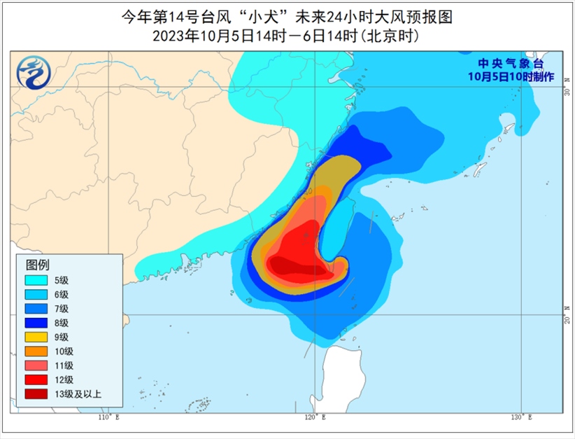 大風(fēng)預(yù)報:5日14時至6日14時,東海大部及釣魚島附近海域、臺灣以東洋面、巴士海峽、臺灣海峽、南海東北部以及浙江沿海、福建沿海、廣東東部沿海、臺灣島沿海將有6-8級、陣風(fēng)9-10級的大風(fēng),其中巴士海峽北部海面、臺灣海峽、臺灣島南部及沿海風(fēng)力將有9-12級、陣風(fēng)12-13級,“小犬”中心經(jīng)過的附近海面風(fēng)力可達(dá)13-14級,陣風(fēng)15-16級。