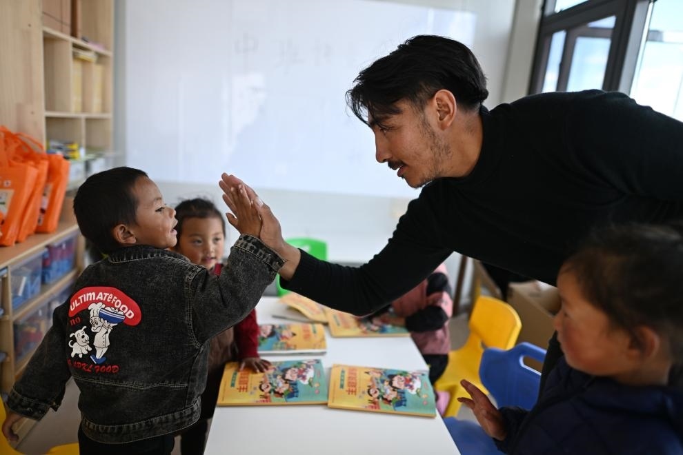 ?在曲麻萊縣秋智鄉(xiāng)布甫村陽(yáng)光幼兒園,秋智鄉(xiāng)幼兒園副園長(zhǎng)才仁戰(zhàn)斗(右二)在課堂上和小朋友互動(dòng)(9月14日攝)。新華社記者 張宏祥 攝