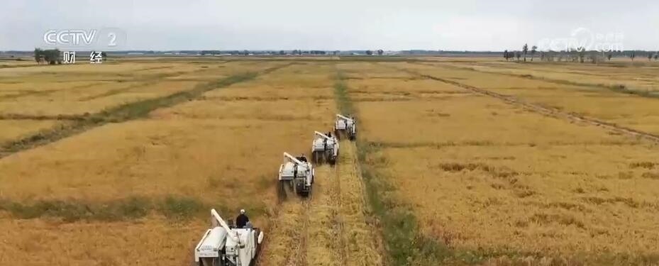 在農(nóng)安縣開安鎮(zhèn)的稻田里,幾臺大型收割機編組作業(yè),往來穿梭在稻田里收割稻谷。
