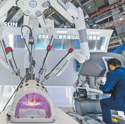 在醫(yī)療器械及醫(yī)藥保健展區(qū),參觀者正在體驗操作復(fù)星醫(yī)藥首臺國產(chǎn)“達(dá)芬奇Xi手術(shù)系統(tǒng)”。人民網(wǎng)記者 翁奇羽攝