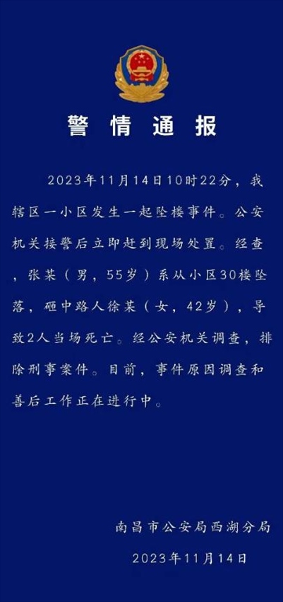 ·南昌警方:男子從小區(qū)30樓墜落砸中女路人,兩人當場死亡。