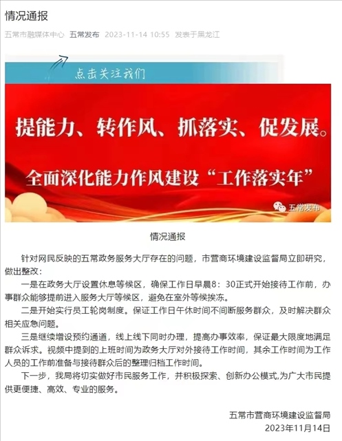 ·黑龍江五常市通報“政務大廳全天工作6小時”:立即做出整改!