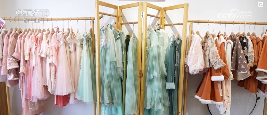 剛開始,這家漢服店只100多套衣服,隨著客流增多,服裝也不停地補充,現(xiàn)在已經(jīng)有大幾百套的漢服,全店上下每天從早到晚一直都要忙著招待。隨著客人不斷變多,他們所在街上的其他商家也紛紛開起了漢服店。一年之間,這里從曾經(jīng)的汽修一條街,變成了擁有5000多名從業(yè)者的漢服一條街。
