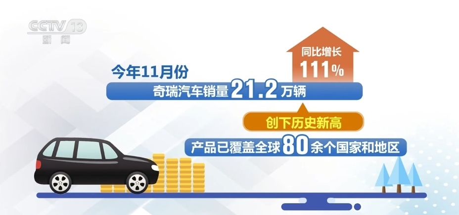 最新數(shù)據(jù)顯示,2023年11月份,奇瑞汽車銷量21.2萬輛,同比增長111%,創(chuàng)下歷史新高,產品已覆蓋全球80余個國家和地區(qū)。