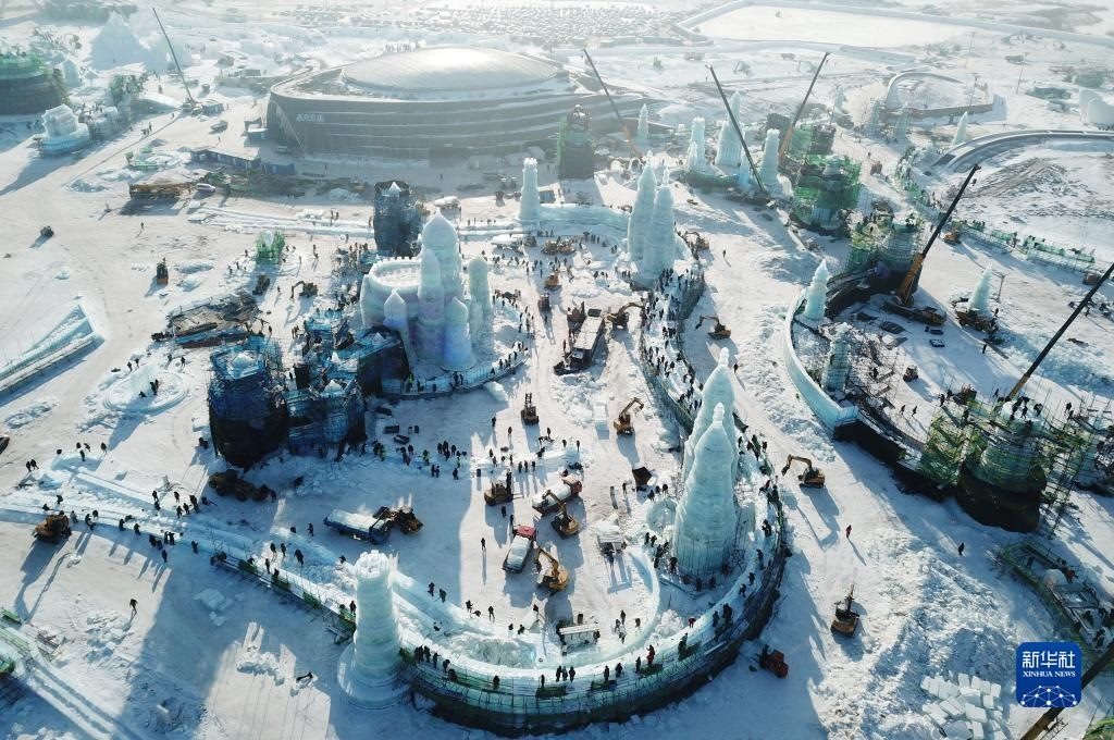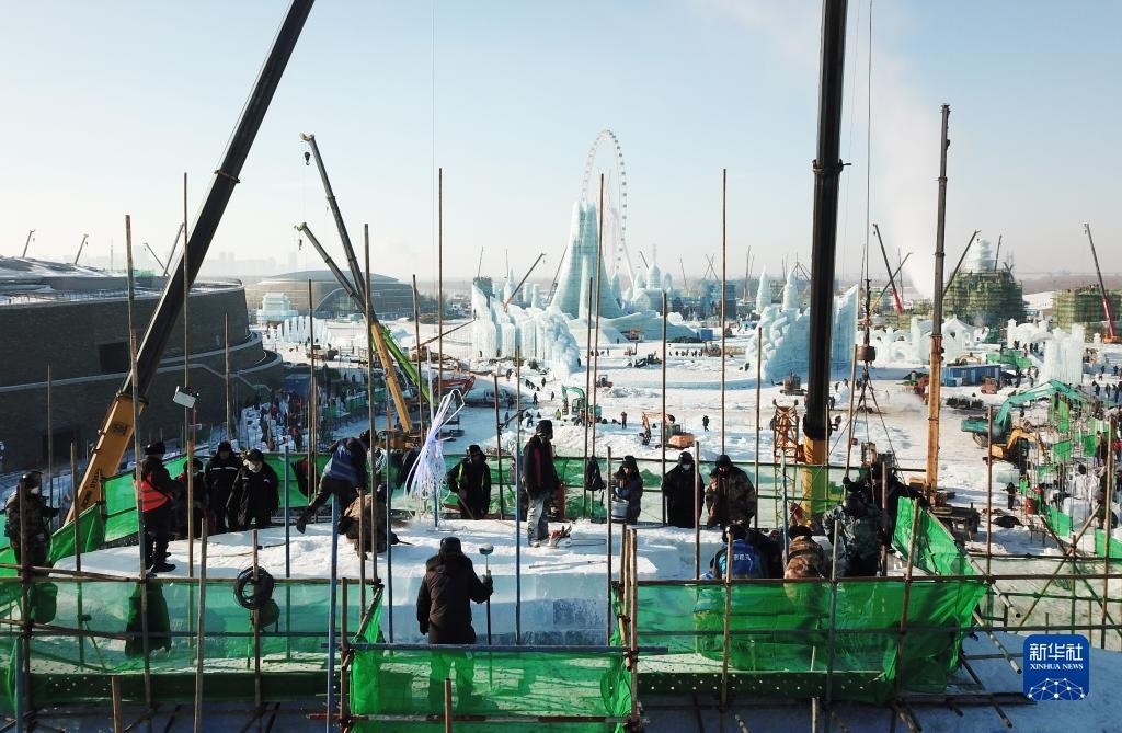 12月12日,在黑龍江省哈爾濱市冰雪大世界建設(shè)現(xiàn)場,工人在零下20多攝氏度的低溫下施工作業(yè)(無人機照片)。