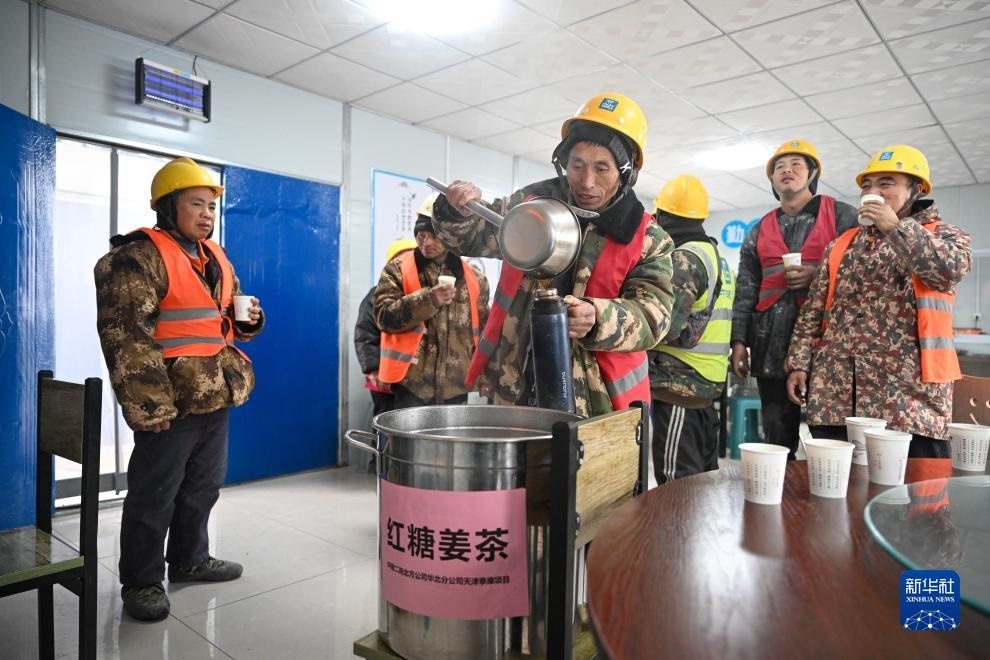 12月12日,在中建二局北方公司天津泰康項目工地,工人在飲用為他們準備的紅糖姜茶驅(qū)寒。