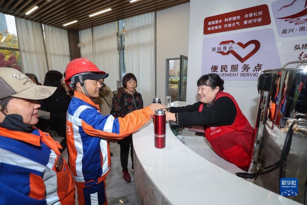 12月12日,在浙江省嘉興市南湖區(qū)的“禾城驛·溫暖嘉”連心驛站,志愿者為環(huán)衛(wèi)工人等戶外工作者提供熱豆?jié){,該驛站近期每天早上向戶外工作者免費提供100多杯熱豆?jié){。