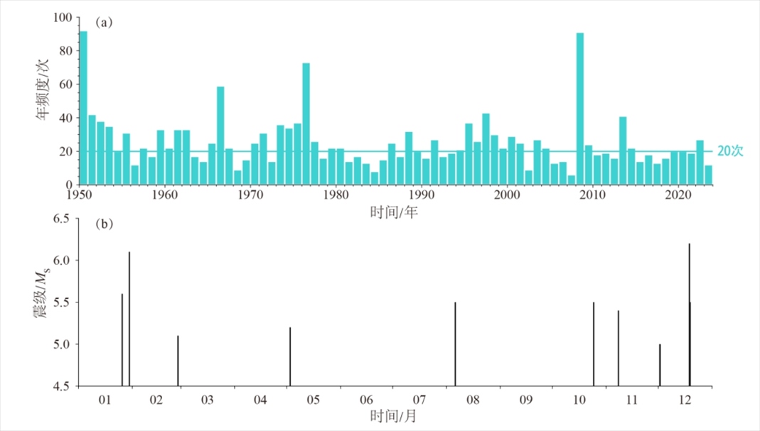 2023年以來大陸地區(qū)發(fā)生5級以上地震11次,最大為12月18日甘肅積石山6.2級地震,活動水平較2022年(27次,最大為2022年1月8日青海門源6.9級地震)和歷史平均水平(20次)明顯偏弱(圖a)。2023年5級以上地震時間分布不均勻,1月至2月發(fā)生3次,3月至9月僅發(fā)生2次,10月至12月增至6次,出現(xiàn)5級以上地震由弱轉強的活動特征(圖b)。