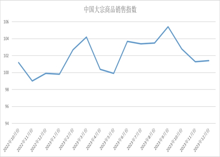 2023年12月份,大宗商品銷售指數(shù)小幅回升0.1個百分點,至101.4%,顯示企業(yè)的冬儲行為及節(jié)前消費(fèi)端備貨為大宗市場需求端提供支撐,銷售指數(shù)上漲,但受制于大宗市場行情低迷,企業(yè)冬儲的熱情不及往年,且加之部分地區(qū)疫情反復(fù),持續(xù)降雪,又進(jìn)一步影響了市場需求,終端企業(yè)采購越發(fā)趨于謹(jǐn)慎,本月銷售指數(shù)增速僅表現(xiàn)為小幅回升。各主要商品中,鐵礦石、原煤、有色金屬和汽車銷售量繼續(xù)增加,增速繼續(xù)加快;化工銷售量均有所增加,但前期石化產(chǎn)品價格上漲主要在于成本和供給層面的驅(qū)動,隨著驅(qū)動力的邊際弱化,以及價格上漲之后的傳導(dǎo)逐步出現(xiàn)阻力,后期價格上漲恐難持續(xù),故銷售增速有所減緩;鋼鐵方面,12月是鋼鐵行業(yè)的傳統(tǒng)淡季,今年大范圍暴雪寒潮天氣使得多地氣溫驟降,也加快了鋼市需求衰減的步伐,整體需求進(jìn)入了季節(jié)性衰退期,市場銷售量出現(xiàn)下降;成品油方面,進(jìn)入12月,需求依舊平淡,且出口量受阻,對煉廠開工仍有制約,導(dǎo)致成品油銷售量下降。