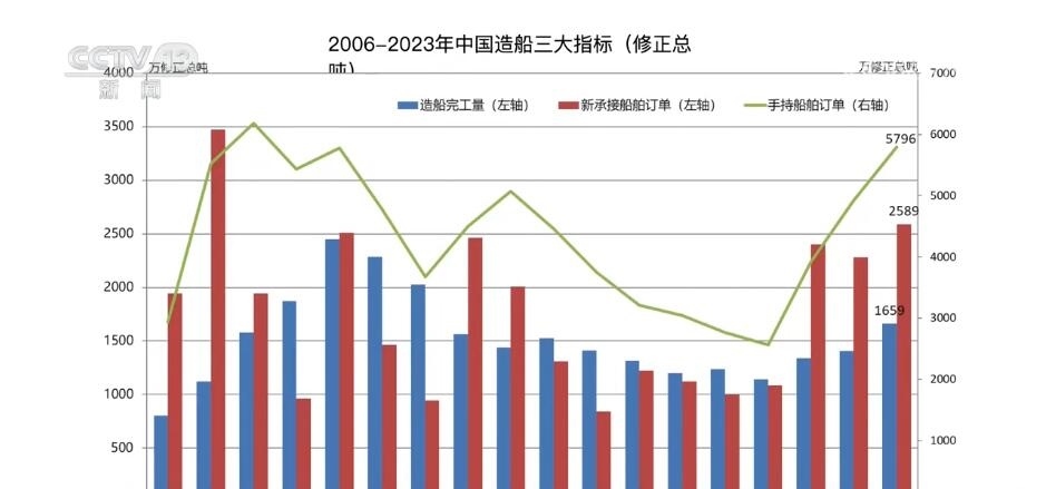 總臺(tái)央視記者 吳天白:在2023年中國造船業(yè)統(tǒng)計(jì)數(shù)據(jù)中,我們還可以看到三大指標(biāo)占國際市場份額分別是50.2%、66.6%和55.0%,首次全部超過50%。