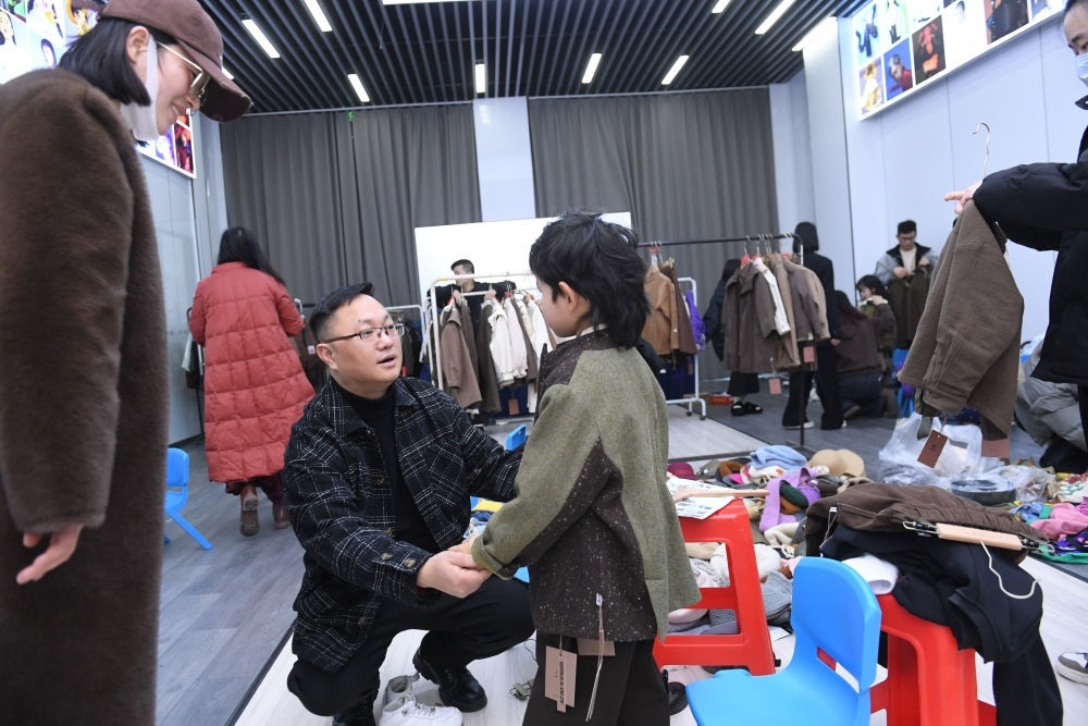 2024年1月17日,在位于浙江省湖州市織里鎮(zhèn)的萬(wàn)順?lè)椆煞萦邢薰?,工作人員(前左二)在品牌的2024秋季新品審版會(huì)后臺(tái)和小模特交流??椑镦?zhèn)是中國(guó)最大的童裝產(chǎn)業(yè)集群地,聚集著1.4萬(wàn)家童裝企業(yè)。新華社記者 翁忻旸 攝