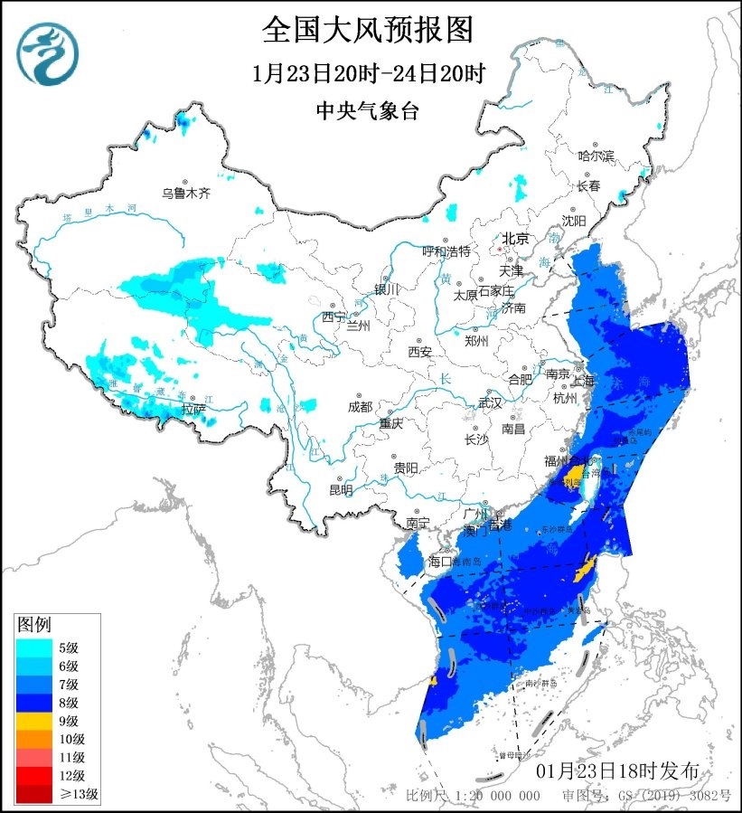 中央氣象臺(tái)1月23日18時(shí)繼續(xù)發(fā)布大風(fēng)藍(lán)色預(yù)警預(yù)計(jì),1月23日20時(shí)至24日20時(shí),西藏南部、青海西部、福建沿海、廣東沿海等地的部分地區(qū)有5~6級(jí)、陣風(fēng)7~8級(jí)的大風(fēng);黃海大部海域、東海大部海域、臺(tái)灣海峽、臺(tái)灣以東洋面、巴士海峽、北部灣、南海大部海域?qū)⒂?~8級(jí)、陣風(fēng)9~10級(jí)的大風(fēng),其中臺(tái)灣海峽、巴士海峽、南海中東和西南部的部分海域風(fēng)力可達(dá)9級(jí)、陣風(fēng)10~11級(jí)。