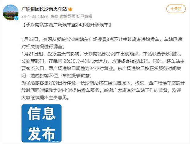 ·凌晨3點不讓中轉(zhuǎn)旅客進站候車?長沙南站致歉并整改:將車站主要客流入口調(diào)整為24小時營業(yè)。