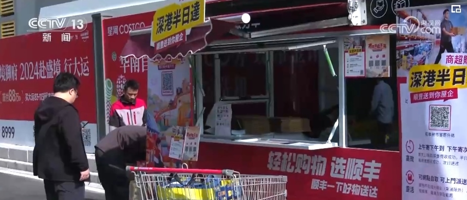 在深圳的這家超市,從出口處向外走兩步,就是快遞公司專門在現(xiàn)場(chǎng)設(shè)置的寄送服務(wù)點(diǎn)。大包、小包的商品從剛剛推出的購(gòu)物車?yán)锉魂懤m(xù)裝進(jìn)打包箱,即發(fā)即走。港澳消費(fèi)者大概前腳剛到家,后腳就能收到貨。