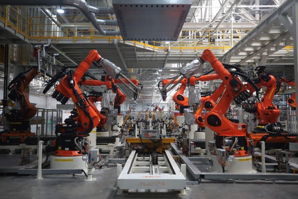 大眾安徽模塊化電驅(qū)動平臺工廠車身車間一角。(2023年5月29日攝)新華社記者 杜瀟逸 攝