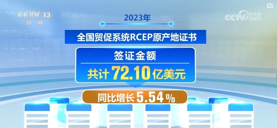 2023年,全國(guó)貿(mào)促系統(tǒng)RCEP原產(chǎn)地證書簽證金額共計(jì)72.10億美元,同比增長(zhǎng)5.54%;簽證份數(shù)共計(jì)21.81萬份,同比增長(zhǎng)38.15%。