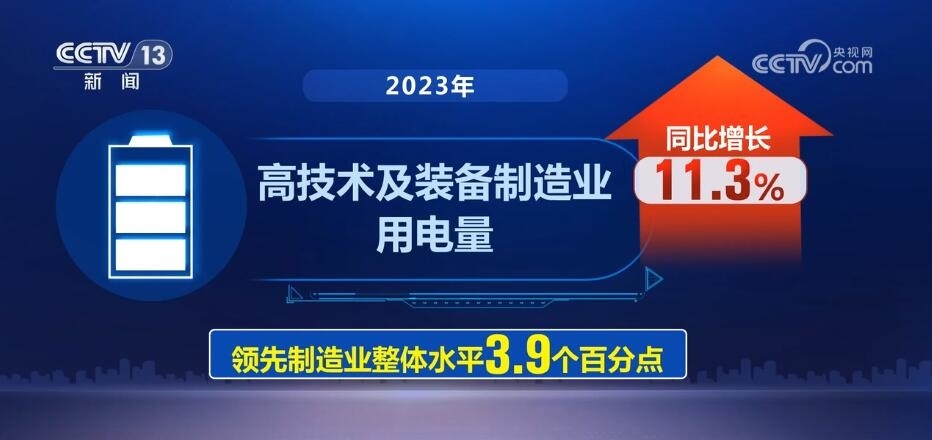 來自中國電力企業(yè)聯(lián)合會(huì)數(shù)據(jù)顯示,2023年,高技術(shù)及裝備制造業(yè)用電量同比增長11.3%,領(lǐng)先制造業(yè)整體水平3.9個(gè)百分點(diǎn)。