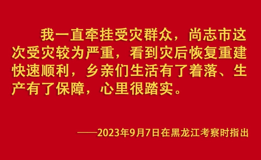 2023年汛期以來,我國(guó)華北、東北等地出現(xiàn)極端降雨,引發(fā)洪澇和地質(zhì)災(zāi)害。習(xí)近平一直牽掛著受災(zāi)群眾,高度重視防汛抗洪救災(zāi)和災(zāi)后恢復(fù)重建工作,多次作出重要指示批示,要求有關(guān)地方和部門全力保障人民群眾生命財(cái)產(chǎn)安全,盡快恢復(fù)災(zāi)區(qū)正常生產(chǎn)生活秩序。2023年9月上旬,習(xí)近平前往黑龍江尚志市看望慰問受災(zāi)群眾;11月,北方入冬之際,習(xí)近平又來到北京、河北受災(zāi)較重的相關(guān)地區(qū),看望慰問受災(zāi)群眾,檢查指導(dǎo)災(zāi)后恢復(fù)重建工作。