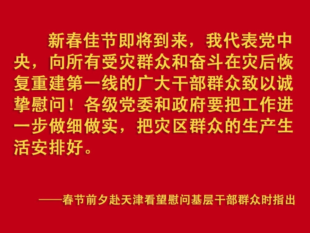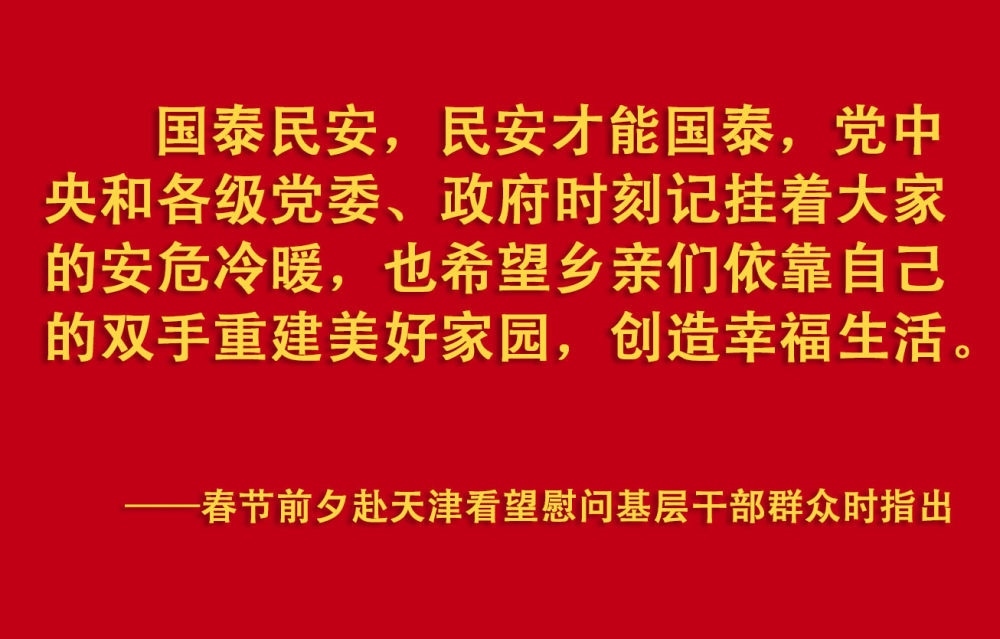 春節(jié)前夕,習(xí)近平總書記在天津考察調(diào)研,看望慰問基層干部群眾。2月1日上午,他首先來到西青區(qū)辛口鎮(zhèn)第六埠村,實(shí)地了解去年洪澇災(zāi)害后當(dāng)?shù)剞r(nóng)業(yè)生產(chǎn)恢復(fù)等情況,看望受災(zāi)群眾。