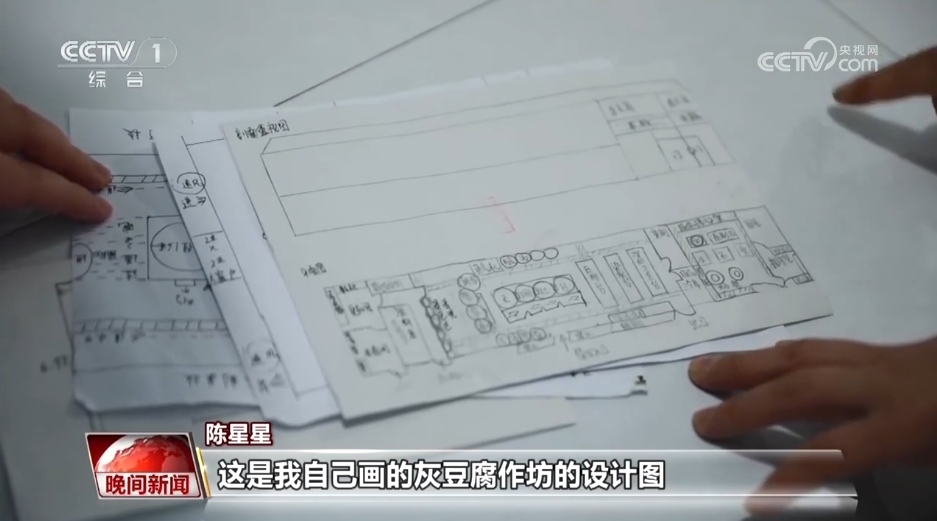 陳星星:這是我自己畫的灰豆腐作坊的設(shè)計圖。我們之前用傳統(tǒng)的在家里做的這種方式做出來的豆腐的話,一天最多可能就是一兩百斤的樣子,那么經(jīng)過我們這樣的一個改進(jìn)的話,一天可能能達(dá)到一兩千斤的產(chǎn)量。