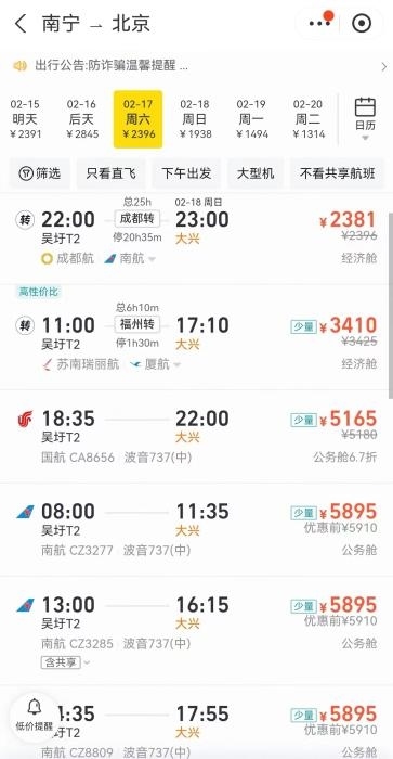 記者15日早間查詢發(fā)現(xiàn),時間充裕的情況下,選擇中轉乘機或臨近目的地乘坐高鐵是一個不錯的選擇。