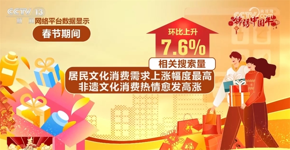 網(wǎng)絡(luò)平臺(tái)數(shù)據(jù)顯示,春節(jié)期間,居民文化消費(fèi)需求上漲幅度最高,非遺文化消費(fèi)熱情愈發(fā)高漲,相關(guān)搜索量環(huán)比上升7.6%。其中,非遺廟會(huì)、燈會(huì)最受游客歡迎。