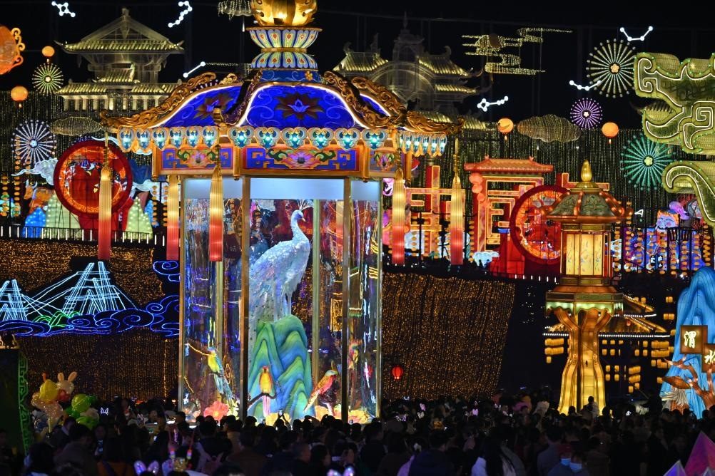 在四川自貢,3萬(wàn)多名游客走進(jìn)“中國(guó)燈城”自貢中華彩燈大世界,觀彩燈、賞演藝、拍全家福??罩校?00架無(wú)人機(jī)排列出湯圓、舞龍燈等圖樣;地面,舞龍舞獅等民俗表演輪番上演,上百名身著漢服的演員手提花燈巡游……