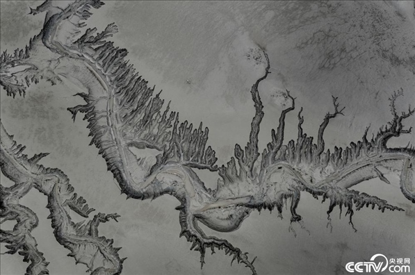 浙江嘉興海寧黃灣鎮(zhèn),錢塘江退潮后出現騰飛的“潮汐巨龍”。