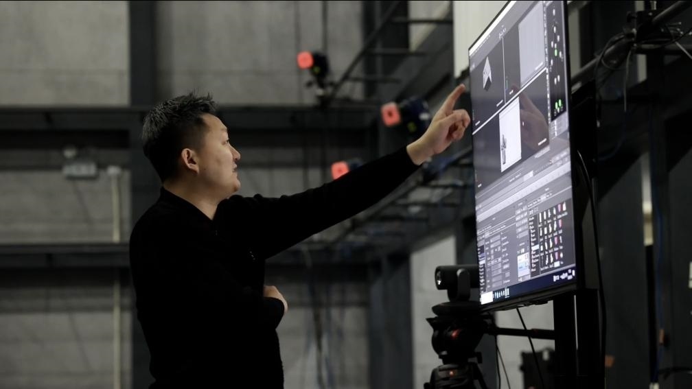 “這是動(dòng)作數(shù)字孿生,利用光學(xué)動(dòng)捕技術(shù),棚內(nèi)多個(gè)專業(yè)攝像頭捕捉演員身上的特定標(biāo)記,以毫秒級(jí)的速率計(jì)算出角色的運(yùn)動(dòng)軌跡,然后將數(shù)據(jù)傳送到電腦上,實(shí)現(xiàn)虛擬人物的動(dòng)作?!眹覄?dòng)漫園公共技術(shù)服務(wù)平臺(tái)動(dòng)捕棚的技術(shù)顧問崔盛輯向記者介紹道。