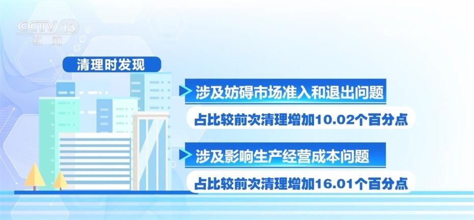 市場監(jiān)管總局表示,本次清理工作雖然取得顯著成效,但在清理時還發(fā)現(xiàn)涉及妨礙市場準入和退出、影響生產(chǎn)經(jīng)營成本等領(lǐng)域問題占比較前次清理分別增加10.02和16.01個百分點,涉及妨礙商品和要素自由流動領(lǐng)域問題仍然較為突出。