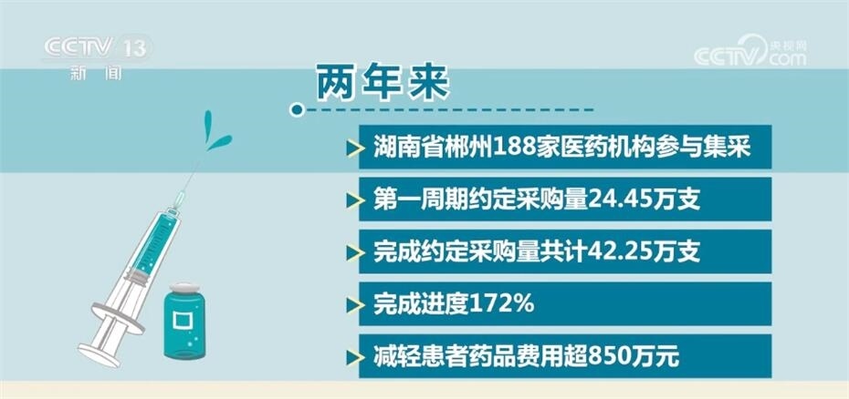 兩年來,湖南省郴州188家醫(yī)藥機構參與集采,第一周期約定采購量24.45萬支,完成約定采購量共計42.25萬支,完成進度172%,減輕患者藥品費用超850萬元。