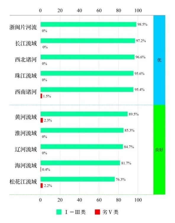 1—3月,長(zhǎng)江、黃河、珠江、松花江、淮河、海河、遼河等七大流域及西北諸河、西南諸河和浙閩片河流水質(zhì)優(yōu)良(Ⅰ—Ⅲ類(lèi))斷面比例為91.5%,同比上升1.2個(gè)百分點(diǎn);劣Ⅴ類(lèi)斷面比例為0.5%,同比上升0.1個(gè)百分點(diǎn)。主要污染指標(biāo)為化學(xué)需氧量、高錳酸鹽指數(shù)和氨氮。其中,長(zhǎng)江流域、珠江流域、浙閩片河流、西北諸河和西南諸河水質(zhì)為優(yōu);黃河流域、松花江流域、淮河流域、海河流域和遼河流域水質(zhì)良好。