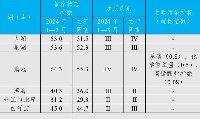 1—3月,監(jiān)測(cè)的201個(gè)重點(diǎn)湖(庫(kù))中,水質(zhì)優(yōu)良(Ⅰ—Ⅲ類(lèi))湖庫(kù)個(gè)數(shù)占比82.1%,同比上升1.1個(gè)百分點(diǎn);劣Ⅴ類(lèi)水質(zhì)湖庫(kù)個(gè)數(shù)占比4.5%,同比下降0.1個(gè)百分點(diǎn)。主要污染指標(biāo)為總磷、化學(xué)需氧量和高錳酸鹽指數(shù)。181個(gè)監(jiān)測(cè)營(yíng)養(yǎng)狀態(tài)的湖(庫(kù))中,中度富營(yíng)養(yǎng)的9個(gè),占5.0%;輕度富營(yíng)養(yǎng)的31個(gè),占17.1%;其余湖(庫(kù))為中營(yíng)養(yǎng)或貧營(yíng)養(yǎng)狀態(tài)。其中,太湖和巢湖水質(zhì)均為良好、輕度富營(yíng)養(yǎng);滇池為輕度污染、中度富營(yíng)養(yǎng),主要污染指標(biāo)為總磷、化學(xué)需氧量和高錳酸鹽指數(shù);洱海水質(zhì)良好、中營(yíng)養(yǎng);丹江口水庫(kù)和白洋淀水質(zhì)均為優(yōu)、中營(yíng)養(yǎng)。