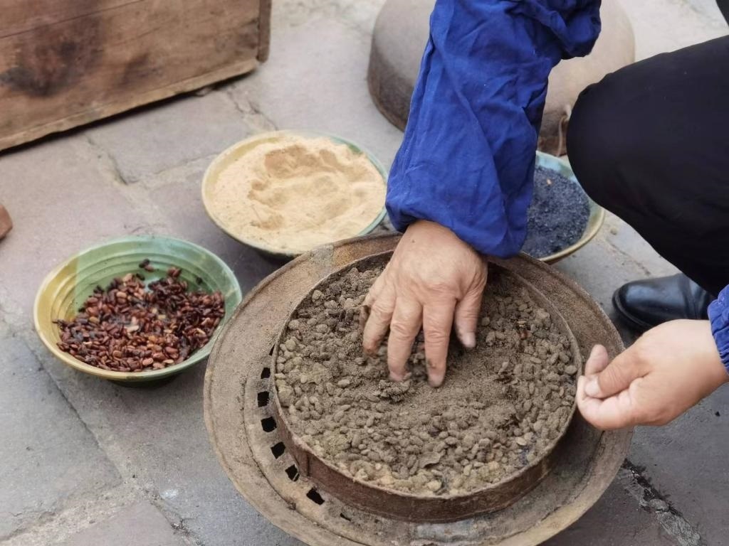 沖好針孔,便在磨石上反復銼尖。隨后倒入熱鍋里翻炒,再舀入一瓢水,針的剛性和硬度由此增加。接下來便輪到三大碗“大陽秘方”登場:白崖土粉末、松木炭和發(fā)酵后的豆豉,用于蒸針?!八赡咎靠梢栽黾愉撫樀暮剂浚嵘捕?;豆豉增加亮度;白崖土粉末作為分散劑讓針受熱均勻。這樣處理后可以保證針質更堅硬又有光澤。”