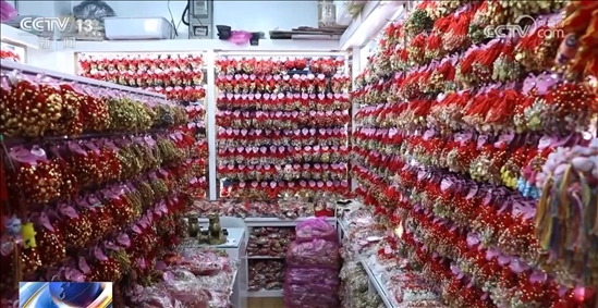 央視網(wǎng)消息:臨近端午節(jié),在浙江義烏,帶有端午元素的五彩繩、手鏈、香囊等各色商品銷售火爆,其中一些蘊(yùn)含龍?jiān)?、好寓意的商品更是受到市場的歡迎。